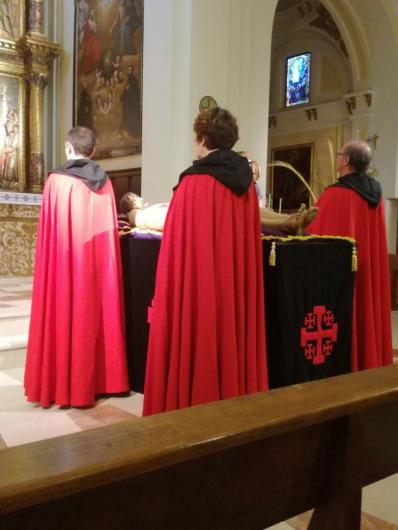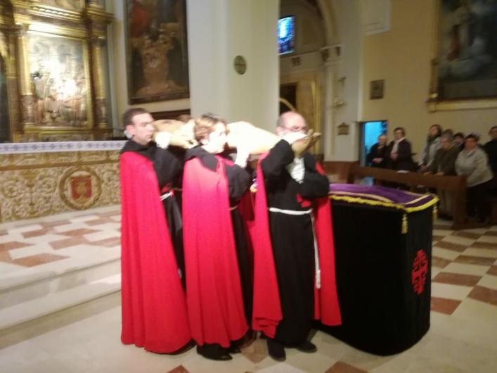 Como tambien viene siendo ya tradicional, los 4 hermanos que velan a Cristo son elegidos en Sorteo el Domingo de Ramos, salvo algunas cesiones que tambien están permitidas. Durante este velatorio se viven momentos muy emotivos, se porta a nuestro Cristo Yacente, se le saca de su hornacina y se le lleva hasta su carroza al final de la Iglesia de Santa María.