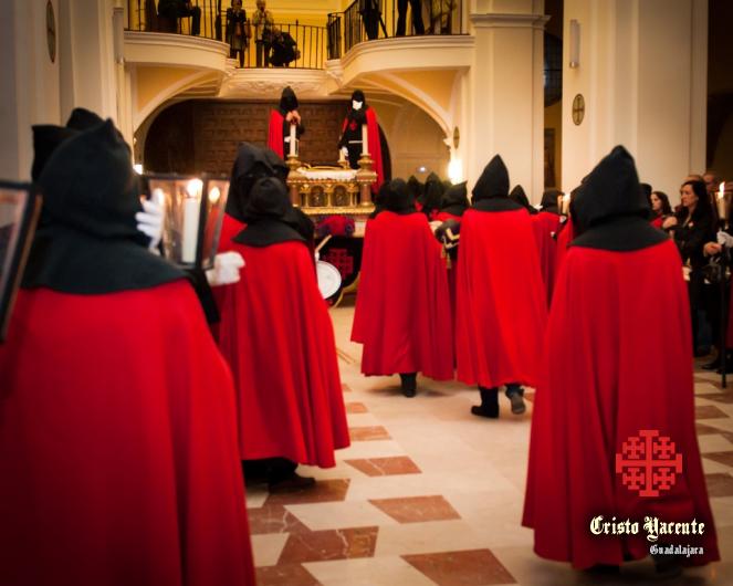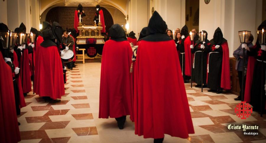 Tanto a la Entrada como a la Salida, se realiza una Procesión del Traslado de la Imagen del Cristo Yacente dentro de la Concatedral de Santa María, con todos los Hermanos en dos hileras escoltando a nuestro Cristo Yacente que es portado por 4 hermanos que han sido seleccionado por sorteo en la Asamblea General realizada el martes anterior. A la Salida suena el himno de la Cofradía compuesto por nuestro hermano Carlos Gargallo ya fallecido, con todo el mundo en Silencio. A la entrada suena "La muerte no es el final" que suele ser entonada por los hermanos.